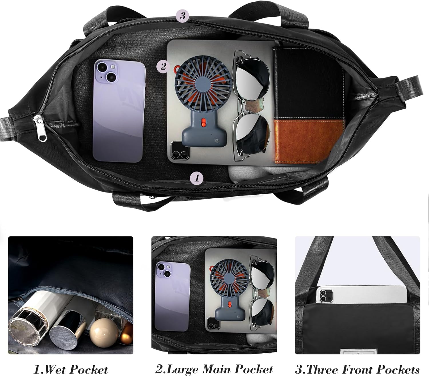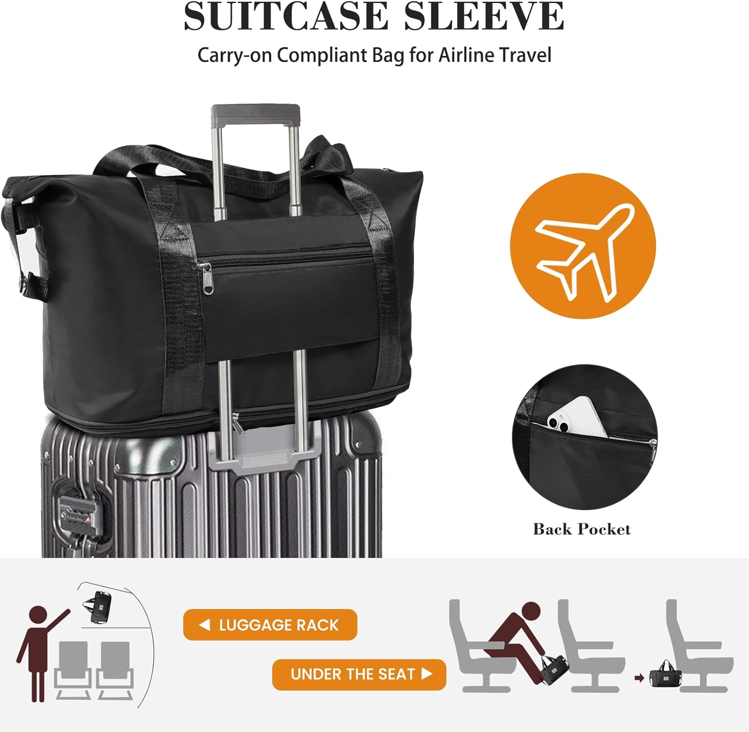 Travel Duffel Bag – Large Shoulder Weekender Overnight Bag, Carry on Bag with Wet Pocket, Waterproof Expandable Duffel Bag with Trolley Sleeve, Sports Tote Gym Bag for Women, Black